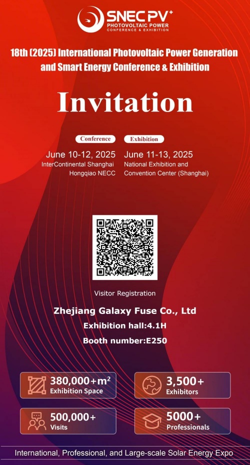 Biz buni e'lon qilishdan mamnunmizZhejiang Galaxy Fuse Co., Ltd. kelgusida namoyon bo'ladi18-Xalqaro fotovoltaik energiya ishlab chiqarish va aqlli energiya konferentsiyasi va ko'rgazma (SNEC PV + 2025)Shanxayda. Fotovoltaik va yangi energiya sohasidagi eng muhim tadbir sifatida SNEC PV + kompaniyasi sanoat tendentsiyalari va eng yangi texnologiyalar va mahsulotlarni namoyish etish uchun etakchi global kompaniyalar va mutaxassislarni birlashtiradi.